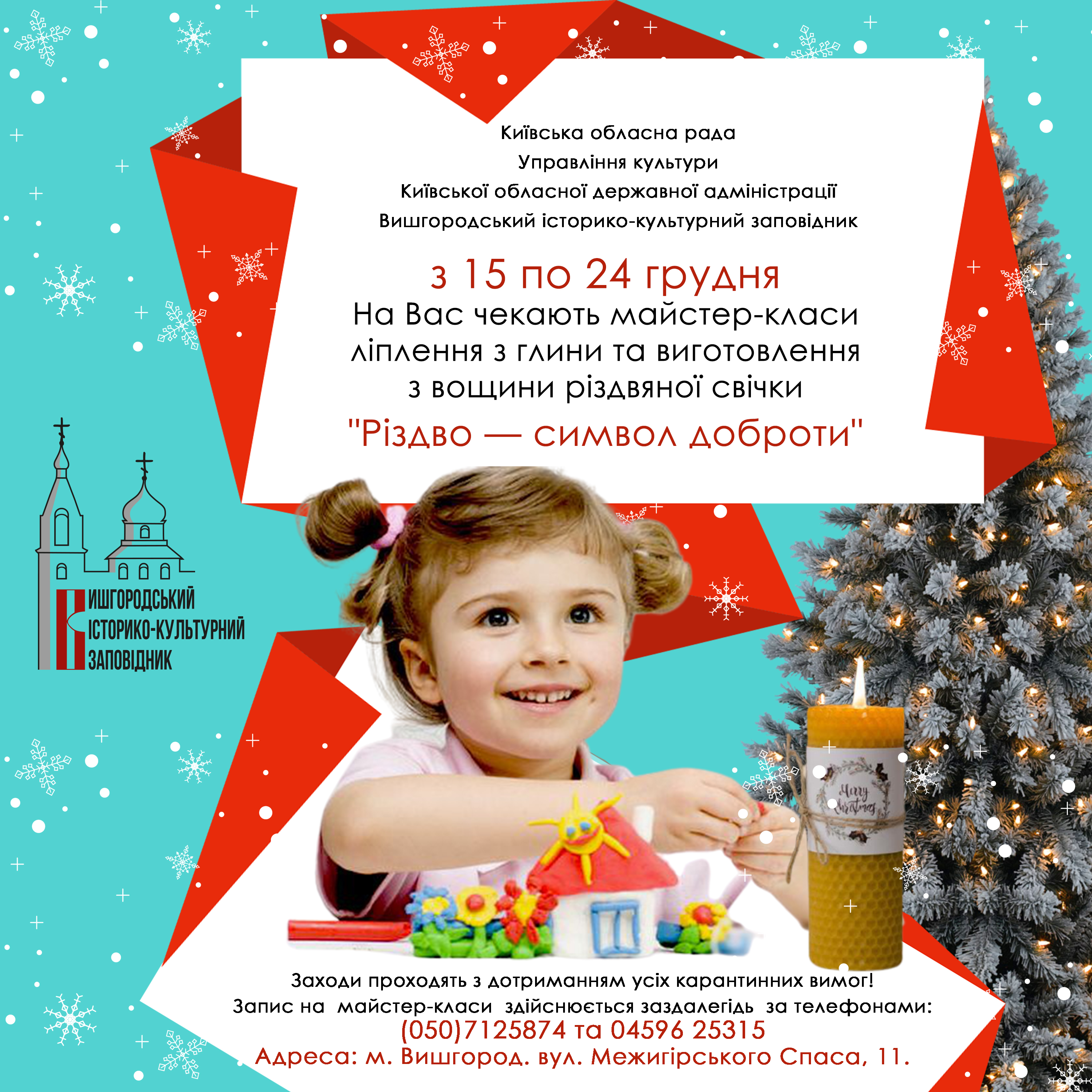 з 15 грудня по 24 грудня кожного дня чекає на вас цикл майстер-класів ліплення з глини та виготовлення з вощини «Різдвяної свічки».